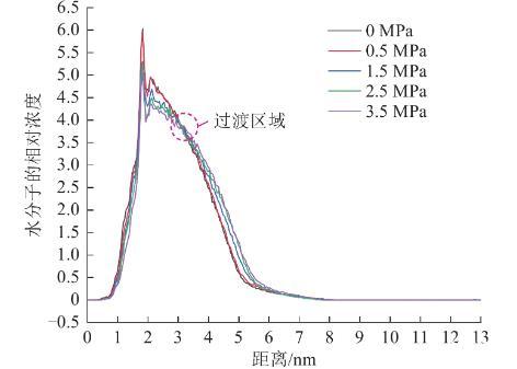 基于不同瓦斯壓力條件下、動力學(xué)模擬時間為500 ps時,煤與水分子的分子動力學(xué)模擬結(jié)果,對不同瓦斯壓力條件下水分子沿Z軸的相對濃度進(jìn)行計算,即可獲得不同瓦斯壓力條件下,水分子的相對濃度(一定法向距離范圍,水分子數(shù)密度與系統(tǒng)內(nèi)水分子總數(shù)密度的比值)分布如圖14所示。
