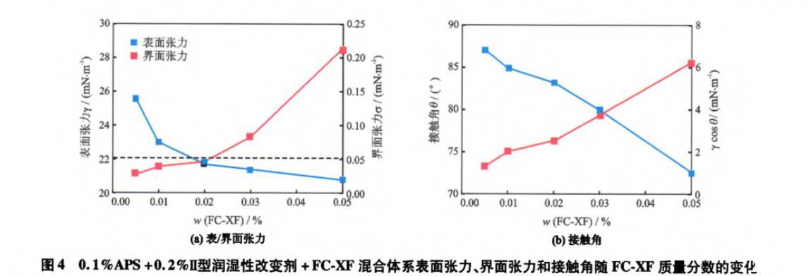 從圖4(b)中可以看出,隨著FC-XF質量分數(shù)由0.005%增加到0.050%,混合體系與巖石的接觸角由87°降低至73°,γcosθ由1.3 mN/m上升到6.3 mN/m。這是由于吸附Ⅱ型潤濕性改變劑和APS使得巖石表面由水濕轉變?yōu)橹行詽櫇?接觸角>87°),更易于吸附FC-XF的碳氟鏈而使親水性頭基在巖石表面暴露,增加了巖石表面的親水性,因而隨著FC-XF質量分數(shù)的增加接觸角減小。