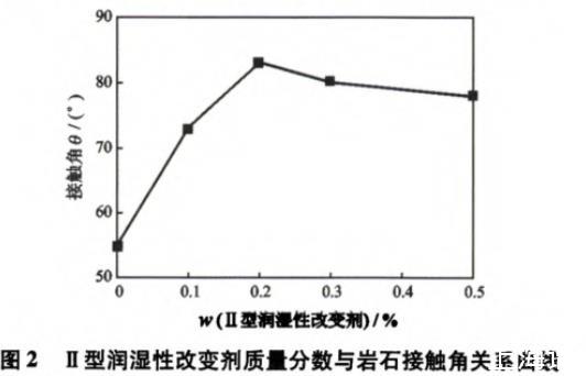 圖2為Ⅱ型潤濕性改變劑質量分數(shù)與巖石的接觸角之間的關系。從圖2可以看出,隨著Ⅱ型潤濕性改變劑質量分數(shù)的增加,接觸角由55°逐漸增大,當加入0.2%Ⅱ型潤濕性改變劑時接觸角可達到83°,繼續(xù)增加濃度接觸角略有減小,但都大于75°。
