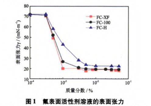 本研究的目的是獲得具有低表/界面張力且與巖石達到近似于中性潤濕的助排劑。首先,需要選擇表面活性劑。表面活性劑溶液達到臨界膠束濃度(cmc)后的表面張力(γcmc)是該表面活性劑溶液能夠獲得的最低表面張力。根據(jù)常見表面活性劑的γcmc數(shù)據(jù),氟表面活性劑能夠使水溶液達到更低的表面張力。因此,在新型助排劑中將選用合適的氟表面活性劑以降低溶液的表面張力。其次,選擇潤濕性改變劑。要達到與巖石接近中性潤濕,需要調節(jié)助排劑在巖石表面的吸附作用,以改變巖石表面的性質使助排劑體系與巖石潤濕接觸角在75°~105°間(90°±15°)。此外,由于氟表面活性劑和潤濕性改變劑一般只能使油水界面張力降低到1 mN/m以上,因此要借鑒化學驅提高采收率中能夠與原油達到超低界面張力的表面活性劑的選擇方法,復配合適的碳氫表面活性劑以獲得能夠同時降低界面張力的助排劑體系。