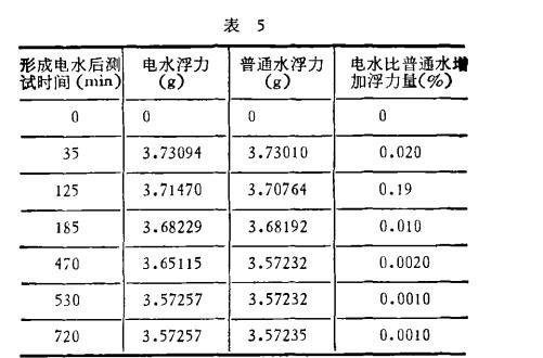 至于電水時間效應的機理問題,特別是浮力變化大的范圍和緩慢變化范圍和水分子及水中雜質儲能的時間長短有何關系,還需要從實驗和理論上進一步研究。