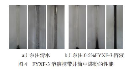 由圖4a)看出,裝有清水的有機玻璃管底部的煤粉沒有被懸浮,且泵注后,排出液中幾乎沒有攜帶出煤粉。由圖4b)看出,裝有0.5%FYXF-3溶液的有機玻璃管底部的煤粉被懸浮,且泵注后,排出液為黑色渾濁液體,攜帶出煤粉質量為0.25g??梢钥闯?,濃度為0.5%的FYXF-3溶液對煤粉的懸浮性能較好,可以將井筒堆積的韓城現場煤粉懸浮,并隨著返排液返排至地面。