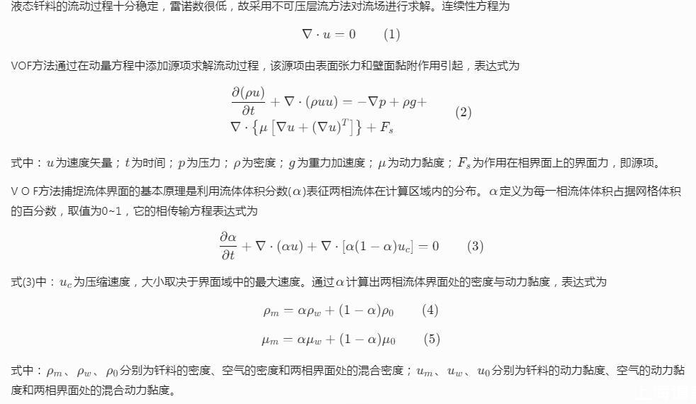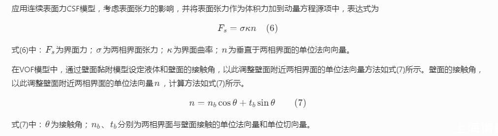 VOF方法通過在動量方程中添加源項求解流動過程,該源項由表面張力和壁面黏附作用引起,表達式為
