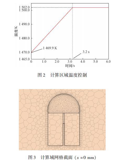 計算域網格截面(x=0mm)如圖3所示,整體上采用多面體網格,在釬料涂覆區域內外均設置邊界層網格,為準確捕捉多余釬料在母材表面的流失過程,對母材表面的網格進行加密。