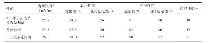 測定了以大豆粕為原料合成的N-椰子油?;鶑秃习被岙a物表面活性性能,同時與陰離子表面活性劑月桂酸鉀、十二烷基硫酸鈉表面活性進行了比較,結果見表4。