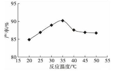 由圖3可以看出,隨著反應溫度逐步升高產物產率也逐步增大,在35℃時產物產率達到最大值,之后反應溫度再升高產物產率逐步下降。因此,選擇反應溫度30~40℃進行優化試驗。