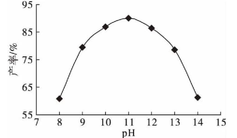 由圖2可以看出,pH影響產率的總體趨勢是首先逐步提高,達到最大值后逐步下降,pH為11時產物產率最大。因此,選擇pH 10~12進行優化試驗。