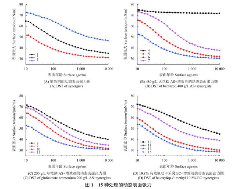 測(cè)定結(jié)果如圖1(A)所示:處理2降低表面張力的速度最快,且在10 000 ms時(shí)表面張力達(dá)到最小值,處理3降低表面張力的速度最慢,說明2#增效劑的效果最好,3#增效劑最差。與未添加增效劑的處理(4,8,12)相比,添加增效劑后除草劑表面張力的降低速度更快,10 000 ms時(shí)所達(dá)到的靜態(tài)表面張力值也更小,其中也是2#增效劑的效果最好。
