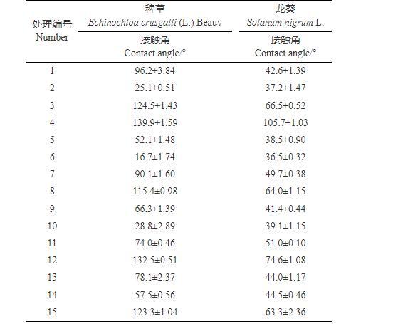 1.2.4接觸角測(cè)定選取新鮮且潔凈的均為6葉期的稗草和龍葵葉片,避開葉脈和病斑,選取平整部分剪取小塊的葉肉,滴加5μL待測(cè)樣品,10 s后記錄接觸角大小,至少重復(fù)3次,計(jì)算平均接觸角。