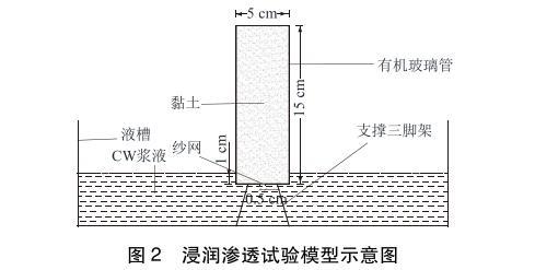 浸潤滲透試驗?zāi)P腿鐖D2所示,主要由液槽、支撐三腳架和透明有機玻璃管組成。有機玻璃管直徑5cm,高15cm,頂端敞開,底部封閉鉆有直徑0.5cm的進(jìn)漿孔。試驗時將黏土裝入有機玻璃管中,振搗壓實,底部開孔處墊有紗網(wǎng),防止土體掉落。將有機玻璃管和支撐三腳架放入漿液槽內(nèi),有機玻璃管底部浸入漿液液面以下1.0cm,使?jié){液從底部滲入黏土中,通過觀察漿液在不同時間的滲透高度來評價漿液的浸潤滲透效果。