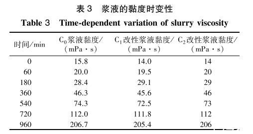 3種漿液在23℃條件下黏度隨時間變化關(guān)系見表3。可以看出:3種漿液的黏度均隨時間的增長而逐漸變大,表面活性劑對漿液的初始黏度以及不同時間的黏度影響很小(最大變化≤1.8mPa·s)。說明加入表面活性劑對漿液的黏度變化無影響。