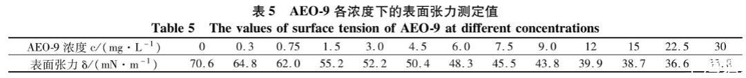 表5 AEO-9各濃度下的表面張力測定值