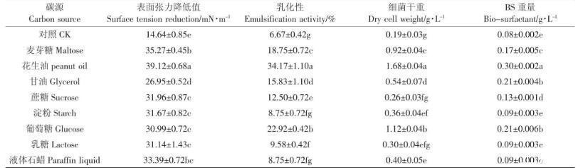 碳源對(duì)細(xì)菌的生長(zhǎng)與發(fā)酵產(chǎn)物量有重要影響。銅綠假單胞菌(Pseudomonas aeruginosa)可在多種類(lèi)型碳源下產(chǎn)生生物表面活性劑,包括甘油、乙醇、植物油等。由表3可知,以花生油為碳源,細(xì)菌發(fā)酵液的降低值為39.12 mN·m-1,明顯高于其他碳源類(lèi)型;乳化值為34.17%,稍高于其他碳源,此時(shí)細(xì)菌生物量最大,糖脂含量最高,為0.30 g·L-1。雖然花生油作為碳源,能夠促進(jìn)菌株產(chǎn)生更多生物表面活性劑,但如果用于實(shí)際生產(chǎn),成本相對(duì)較高,近年來(lái)一些研究者嘗試使用成本較低的工業(yè)副產(chǎn)物如糖蜜、廢潤(rùn)滑油等作為碳源,發(fā)現(xiàn)也具有很好的促進(jìn)微生物產(chǎn)生生物表面活性劑的作用。因此,后期會(huì)考慮選擇用一些低成本碳源進(jìn)行發(fā)酵。