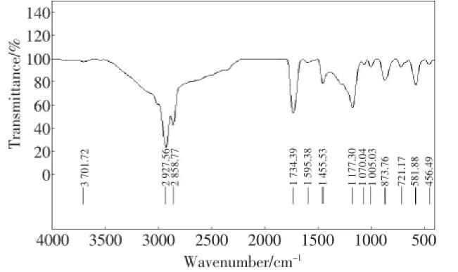 將菌株147產(chǎn)物提純,紅外光譜儀(FT-IR)分析物質(zhì)結(jié)構(gòu),結(jié)果如圖2。該物質(zhì)在3701.72cm-1處有吸收峰,表明分子中有羥基存在;2 858.77~2 927.56 cm-1處的吸收峰表明存在糖類(lèi)C-H的伸縮振動(dòng),1400~1200 cm-1處是C-H變角振動(dòng),1 734.39 cm-1處是C=O的雙鍵振動(dòng),而1 070.04 cm-1處為C-O-C鍵伸縮振動(dòng),因此該物質(zhì)中有一個(gè)五元環(huán)狀內(nèi)酯和糖苷鍵存在。由此進(jìn)一步證明該生物表面活性劑含糖脂類(lèi)物質(zhì)。