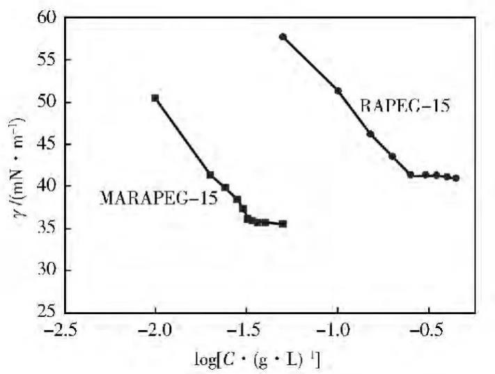 由圖2可以看出:MARAPEG-15的表面張力低于RAPEG-15的表面張力,而且當達到表面張力的曲線拐點時,發現MARAPEG-15的臨界膠束濃度也低于RAPEG-15的臨界膠束濃度。