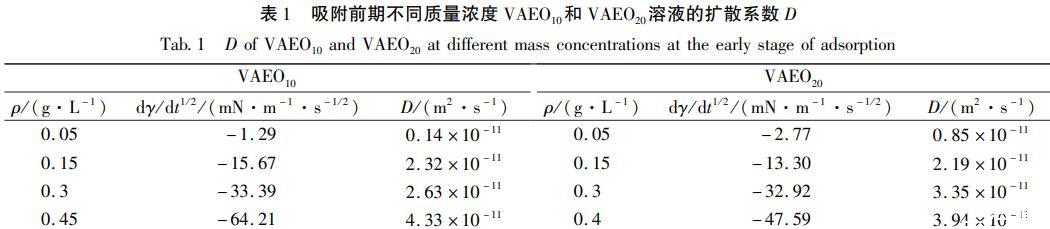在初始吸附階段,表面層VAEO分子很少,可以用方程(2)來(lái)表述表面張力與時(shí)間的關(guān)系,對(duì)非離子表面活性劑,式中n=1.以y(t)對(duì)t/2作圖,結(jié)果見(jiàn)圖3.短時(shí)間內(nèi)γ(t)與t1/2成直線(xiàn)關(guān)系,直線(xiàn)截距對(duì)應(yīng)溶劑的表面張力,擴(kuò)散系數(shù)D可由直線(xiàn)斜率求出,結(jié)果見(jiàn)表1.