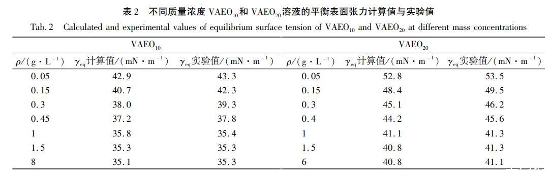 從以上對(duì)VAEO10和VAEO20在氣/液界面的吸附行為的研究可知,當(dāng)質(zhì)量濃度小于cmc時(shí),二者在吸附前期均表現(xiàn)為擴(kuò)散控制吸附,擴(kuò)散系數(shù)D的數(shù)量級(jí)為10-11m2/s,在吸附后期均為混合動(dòng)力控制吸附,表觀(guān)擴(kuò)散系數(shù)Da的數(shù)量級(jí)為10-12m2/s.膠束存在時(shí),τ2較長(zhǎng),大于到達(dá)γeq所需時(shí)間teq,膠束形成不影響表面張力隨時(shí)間的變化趨勢(shì)。據(jù)文獻(xiàn)報(bào)道,壬基酚聚氧乙烯醚(NPEO9)濃度小于cmc時(shí)的擴(kuò)散系數(shù)為3.9×10-10m2/s(滴體積法),平衡表面張力為30.6mN/m,可推測(cè)NPEO10的擴(kuò)散系數(shù)在3.9×10-10m2/s附近,大于本研究中VAEO10的擴(kuò)散系數(shù)。VAEO的疏水部分分子結(jié)構(gòu)比NPEO的大,前者較后者多一個(gè)縮醛環(huán)和一個(gè)甲氧基,這兩個(gè)基團(tuán)一方面造成VAEO的空間體積較大,另一方面,縮醛環(huán)中的——O-與水分子可能形成氫鍵,均增加了VAEO擴(kuò)散時(shí)的阻力,因而降低了擴(kuò)散速率。
