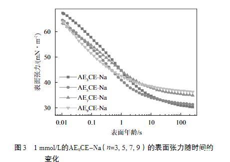 前面已經(jīng)討論了溶液平衡時的特性與規(guī)律,但沒有考慮平衡及老化的時間,而時間因素在實際應(yīng)用中起著決定性的作用。當表面活性劑分子從本體相遷移到表面時,分子的動態(tài)吸附性能會影響表面活性劑的性能。因此,如圖3所示,測試了1 mmol/L的不同EO加合數(shù)的AEnCE-Na的表面張力隨時間的變化曲線。
