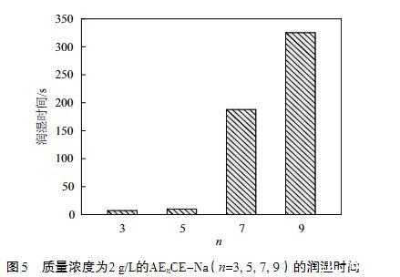 從圖5中可以得到,AEnCE-Na的潤濕時間隨EO加合數(shù)的增大而增大,也就是說,潤濕能力隨EO數(shù)的增大而逐漸減弱,這主要是親水性增強的結(jié)果。其中,AE3CE-Na和AE5CE-Na的潤濕時間均小于10 s,樣品的潤濕性能較好。