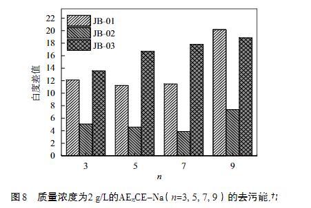 洗滌劑在生活和生產(chǎn)中都扮演著重要的角色,而表面活性劑是各種洗滌劑的主要成分。因此,測試了JB-01,JB-02及JB-03三種污布在不同EO加合數(shù)的表面活性劑溶液AEnCE-Na中洗滌前后的白度值,并將同一塊污布在洗滌前后的白度值作差,得到如圖8所示的結(jié)果。