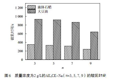 表面活性劑的另一大用途是通過降低油/水界面的界面張力而用作乳化劑,穩(wěn)定存在的乳液被廣泛應(yīng)用于食品、藥品和個人護理等方面。因此,測試了不同EO加合數(shù)的AEnCE-Na對大豆油和液體石蠟的破乳時間,結(jié)果如圖6所示。