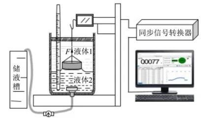 圖1為自制2種液體間界面張力的動態(tài)實時測量裝置圖,該儀器主要包括電腦顯示器、同步信號轉(zhuǎn)換器、自制實驗架臺、力敏傳感器、金屬吊環(huán)、恒溫杯、溫度計、排液孔、排液管、流速調(diào)節(jié)器和儲液槽等組成.