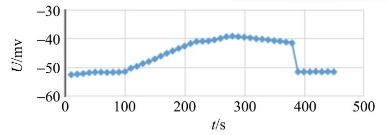金屬吊環(huán)這一運動過程中電壓值也趨于平穩(wěn),對應于圖2中380~450 s這一時間段的變化曲線.