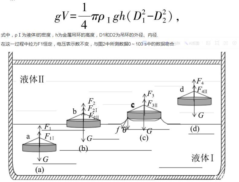 2)金屬吊環(huán)從液體Ⅰ中進入液體Ⅱ中