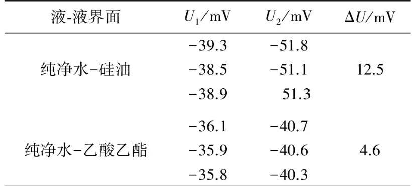 實驗測量所用金屬吊環(huán)的外徑、內(nèi)徑分別為0.034 96 m和0.033 10 m.在20℃實驗條件下,采用自制2種液體間界面張力的動態(tài)實時測量儀,測量了純凈水-硅油和純凈水-乙酸乙酯間的界面張力.測量出金屬吊環(huán)由液體I中完全進入液體Ⅱ的過程中,液體I的液膜被拉斷前電壓的最大值U1,拉斷后趨于穩(wěn)定時的電壓值為U2,數(shù)據(jù)結果如表1所示.