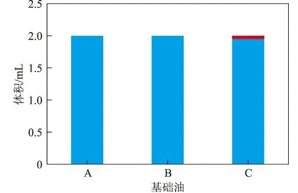 由圖1可以看出:未加復合劑時不同基礎油的分水效果不同,基礎油A和基礎油B的分水效果較好,水在離心作用下全部分出;基礎油C的極性物質含量高,親水性強,分水能力差,因此出現了乳化層。