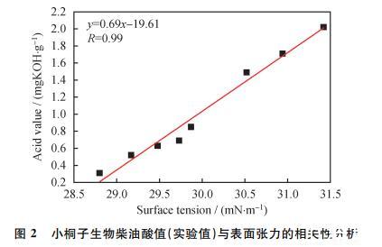 同時,對樣品的酸值與表面張力進行了相關性分析,如圖2所示: