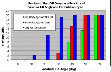 原始配方中超過一半以上的液滴在20°的傾斜角滾落,40°時,全部液滴滾落。Agrosurf NEC38比Agrosurf SSP更有效,可防止所有液滴在30°時滾落,避免60%的液滴在40°滾落??蛻艨筛鶕@種方法,尋找更加優異的表面活性劑。