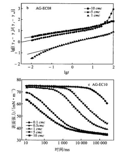 在25cc下測定不同濃度AG.EC水溶液的DST,并利用Rosen模型處理,得到其動態表面張力參數,見圖4、表1。