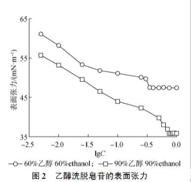 經(jīng)大孔吸附樹脂純化得到2種皂苷樣品,其表面活性分析表明:60%乙醇和90%乙醇洗脫得到的皂苷的臨界膠束濃度分別為0.35和0.75 g/L,最低表面張力分別為47.43和35.83 mN/m。