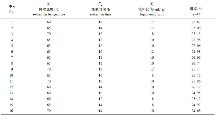 按照1.2.1節(jié)操作在時間8 h和溫度45℃條件下,考察提取液料比對肥皂莢皂苷得率的影響。由圖1(c)可知,液料比值為5~10時,隨著液料比的增加,皂苷得率也隨之增大,因為提取液的增加,增加了溶劑與原料的接觸面積,有利于皂苷得率的增加;但當液料比值超過10時,由于溶劑量較大反而會影響到皂苷與溶劑之間的物質(zhì)交換,皂苷得率呈現(xiàn)略微下降的趨勢。