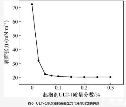 當起泡條件相同時,起泡劑水溶液的表面張力越低,發泡體積越高。配制一系列濃度梯度的起泡劑ULT-1水溶液,利用接觸角/表面張力測量儀采用懸滴法測量表面張力與起泡劑ULT-1質量分數的關系,結果如圖6所示。從圖6可知:當起泡劑ULT-1質量分數小于0.05%時,表面張力隨起泡劑ULT-1質量分數的提高快速降低;當起泡劑ULT-1質量分數大于0.05%時,表面張力降幅越來越小;當起泡劑ULT-1質量分數提高至0.2%時,表面張力降至20.40 mN/m,較蒸餾水降低了71.82%,繼續提高起泡劑ULT-1的質量分數,表面張力不再降低。表明新型起泡劑ULT-1在較低濃度時即達到較低的表面張力,有利于提高發泡體積。