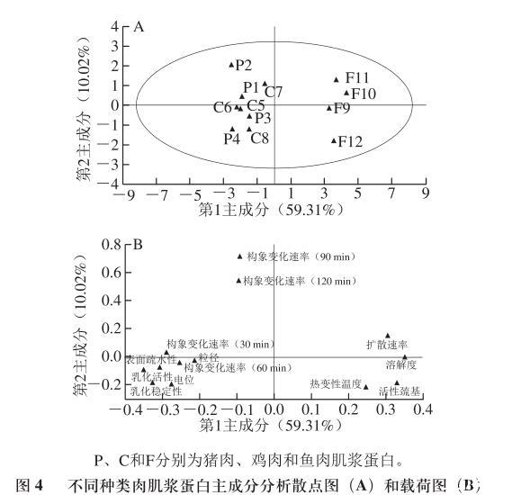 由于測量指標(biāo)間存在線性相關(guān)性,單一的指標(biāo)不能更清楚地反映出不同種類肉肌漿蛋白間的差異性,因此進(jìn)一步進(jìn)行主成分分析。由圖4A可知,第1主成分占59.31%,第2主成分占10.02%,總共占比69.33%,其中樣本F10、F11以及F12對(duì)第1主成分貢獻(xiàn)率較大,且與第1主成分呈正相關(guān),而C7樣本對(duì)第2主成分貢獻(xiàn)率較大且呈正相關(guān)。由圖4B可知,肌漿蛋白的擴(kuò)散速率、溶解度、乳化活性、乳化穩(wěn)定性、表面疏水性、電位、構(gòu)象在30 min及60 min時(shí)的變化速率對(duì)第1主成分貢獻(xiàn)率較大,其中擴(kuò)散速率和溶解度與第1主成分呈正相關(guān),而除此以外的其他指標(biāo)與第1主成分呈負(fù)相關(guān)。而蛋白的構(gòu)象在90 min以及120 min時(shí)的變化速率對(duì)第2主成分的貢獻(xiàn)率較大。圖中的乳化活性、表面疏水性、乳化穩(wěn)定性及電位間距離較近,說明這些指標(biāo)間存在一定的相關(guān)性。綜合前述的研究結(jié)論可知肌漿蛋白的乳化活性和乳化穩(wěn)定性與其表面疏水性、電位和構(gòu)象變化速率有較強(qiáng)的相關(guān)性,而擴(kuò)散速率與溶解度間相關(guān)性較強(qiáng)。