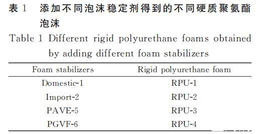根據傳統制備工藝制備硬質聚氨酯泡沫,分別把添加國產-1、進口-2、PAVE-5和PGVF-6泡沫穩定劑得到的硬質聚氨酯泡沫命名為RPU-1、RPU-2、RPU-3、RPU-4。