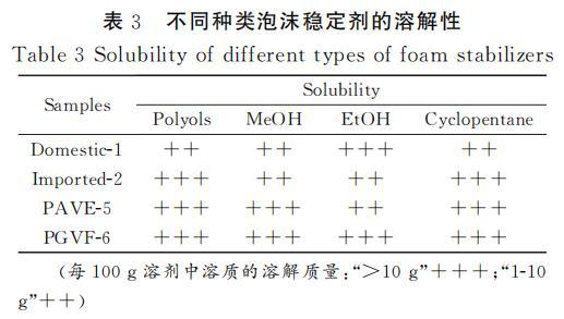 聚氨酯發泡過程中,各原料之間的相容性對泡沫的性能有重要影響。相容性好的原料可以確保發泡過程中的化學反應順利且充分進行,從而獲得均勻、細膩的泡沫結構,提高泡沫的物理性能和使用性能。表3是不同種類泡沫穩定劑在不同溶劑中的溶解性測試,通過測試結果可知,經過接枝改性后的PAVE-5和PGVF-6在多元醇和環戊烷中的溶解性較好,和國產-1、進口-2等泡沫穩定劑都能夠很好的溶解在多元醇和環戊烷中。PGVF-6和PAVE-5在多元醇中表現出的優良溶解性主要得益于POSS接枝的APEG鏈段的醚鍵和羥基都具有明顯的極性,這使得其分子間以及與其他極性分子間可以形成較強的極性相互作用。這種相互作用有助于分子間的相容性,對聚氨酯泡沫的形成和性能有積極作用。