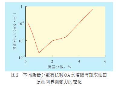 由水溶性好且不易揮發的有機堿OA水溶液在不同質量分數時與孤東油田原油之間界面張力的關系可以看出,當有機堿OA水溶液質量分數為0.1%~1.0%時,界面張力隨有機堿OA水溶液質量分數的增加迅速下降,當有機堿OA質量分數超過1.0%后,界面張力逐漸升高。表明有機堿OA水溶液與孤東油田原油作用可降低界面張力,且最佳的有機堿OA水溶液質量分數為1.0%。