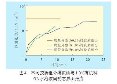 使用航空煤油與孤東油田原油分離出的膠質組分配制成模擬油,測定不同質量分數膠質組分的模擬油與不同質量分數有機堿OA水溶液間的動態界面張力。從實驗結果可以看出,有機堿OA水溶液與孤東油田原油中的膠質組分發生作用,使有機堿OA水溶液與膠質組分模擬油間的界面張力初始值最低,而穩態值較高。當堿質量分數一定時,膠質組分質量分數為1.0%和5.0%時都可與堿產生足夠多的活性物質,從而降低界面張力。