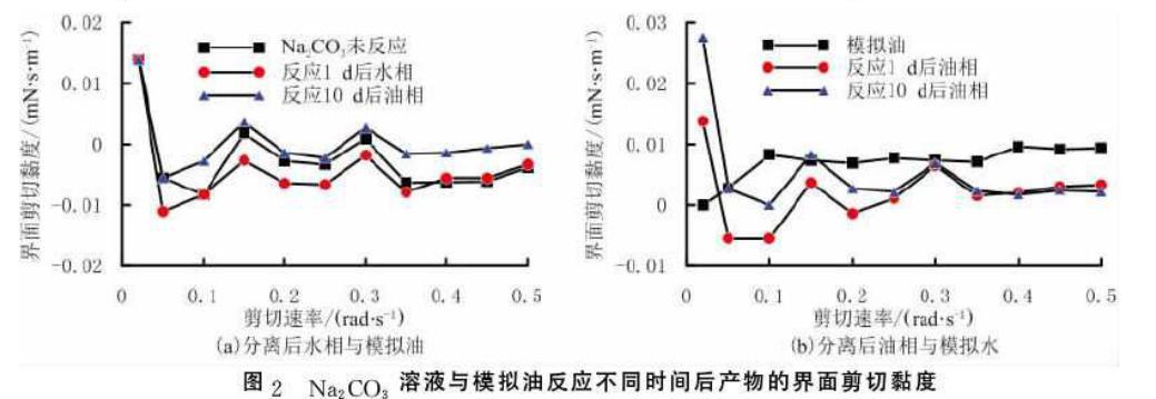 Na2CO3溶液與模擬油反應(yīng)不同時(shí)間后產(chǎn)物的界面張力、剪切黏度(二)