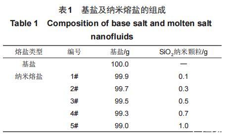 本實驗所用材料為NaNO3、KNO3和30nm的SiO2納米顆粒。所有實驗材料在制備納米熔鹽之前均需要經過干燥處理。使用型號為Mettler Toledo ME104,精度為0.1mg的電子天平對干燥后的熔融鹽和納米顆粒進行稱量。見表1,按照比例將基鹽及納米顆粒進行稱量后,利用高溫熔融法將SiO2納米顆粒均勻分散至基鹽中,將制備好的納米熔鹽樣品放入干燥箱中保存備用。