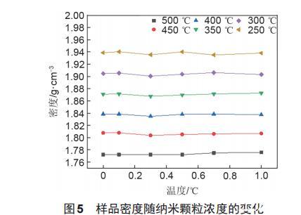 研究表明,在solar salt中加入SiO_2納米顆粒后,熔點(diǎn)會(huì)有一定程度的下降,分解溫度會(huì)有一定程度的提高。并且solar salt的熔點(diǎn)為218.2℃,所以當(dāng)熔鹽加熱到250℃時(shí),已經(jīng)完全熔化;當(dāng)熔鹽溫度超過600℃時(shí),熔鹽會(huì)開始分解。溫度較高和溫度較低都會(huì)對(duì)實(shí)驗(yàn)測(cè)量的數(shù)據(jù)產(chǎn)生影響,造成較大的實(shí)驗(yàn)誤差。因此基鹽及納米熔鹽密度實(shí)驗(yàn)數(shù)據(jù)測(cè)定范圍為260~500℃。