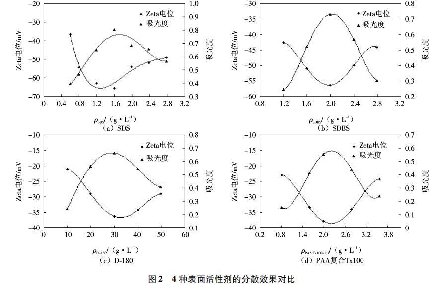 本實驗以十二烷基硫酸鈉(SDS)、聚丙烯酸(PAA)復合曲拉通(Tx100)、分散助劑DISPERBYK-180(D-180)和十二烷基苯磺酸鈉(SDBS)等4種表面活性劑作為分散劑,采用超聲分散法制備了分散均勻的CNFs懸浮液.結合紫外/可見分光光度計法、透射電鏡(TEM)及場發射掃描電鏡(FESEM)、Zeta電位法、表面張力測試、靜置及離心分離法,研究了不同表面分散劑對CNFs在水性體系中分散性的影響,并對分散機理進行了討論.