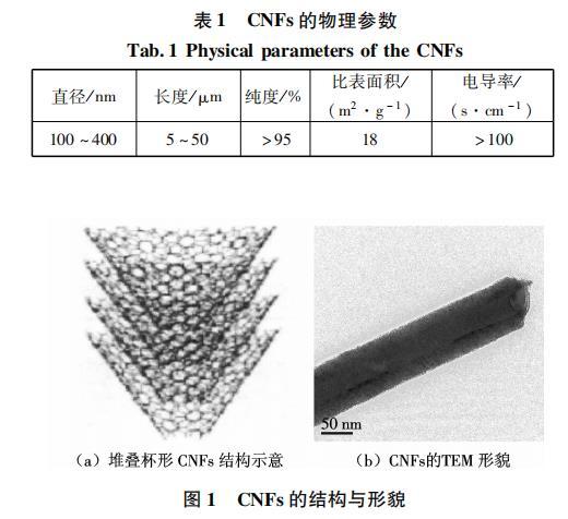 納米碳纖維(carbon nanofibers,CNFs)是近十年興起的一種新型亞微米增強纖維材料,它是化學氣相生長碳纖維的一種形式,一般通過裂解氣相碳氫化合物制備,是構成以碳黑、富勒烯、單壁和多壁碳納米管為一端,以連續碳纖維為另一端鏈節中的一環.CNFs的直徑一般在150~400nm之間,與碳納米管(CNTs)相比,CNFs的制備更易于實現工業化生產.CNFs有著優異的物理性能、力學性能和化學性能.研究表明,CNFs的抗拉強度可以達到2~5 GPa,平均彈性模量為300 GPa.除具有普通氣相生長碳纖維的特性,如低密度、高比模量、高比強度、高導電性等性能外,CNFs還具有缺陷數量少、比表面積大、結構致密等優點,這使得CNFs在納米復合材料領域得到了廣泛的應用.然而,納米復合材料的性能往往會受到兩個主要因素的影響,一個是納米材料在基體材料中的分散程度,另一個是納米材料表面與基體材料之間的黏結強度和能量.由于受到范德華力的的影響,CNFs彼此吸引并相互纏結在一起,懸浮于水的表面,幾乎無法均勻溶解,這大大制約了CNFs在復合材料中的應用.如何解決CNFs在水性體系中的分散已成為研究者廣泛關注的熱點.