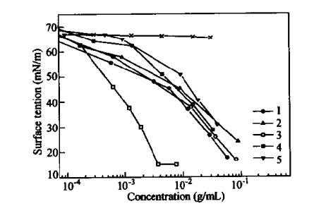 聚丙烯酸(PAA)是研究較多的合成聚電解質,其分子鏈在水溶液中離解而帶有大量羧酸陰離子,Ishimuro等較詳細研究了PAA水溶液的表面張力隨其離解度(PH值)及離子強度(NaCl濃度)的變化。根據含氟烴聚乙二醇的研究可知,全氟烴具有極強的憎水特性,當它作為長鏈分子的一個端基于水溶液中時,鏈端趨向于向空氣-水界面的吸附,而長鏈則由于與溶劑水的相互作用而在水中形成尾形鏈構象。尤其在高表面濃度時,形成十分特殊的刷狀高分子。從分子設計來看,若能合成出全氟烴端基聚丙烯酸,由于其端基的特殊結構,它將表現出完全不同于普通聚丙烯酸的界面吸附行為。