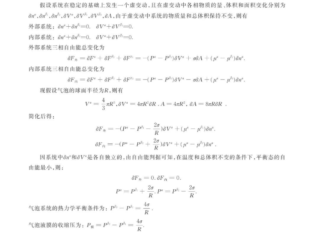 假設(shè)系統(tǒng)在穩(wěn)定的基礎(chǔ)上發(fā)生一個(gè)虛變動(dòng),且在虛變動(dòng)中各相物質(zhì)的量、體積和面積變化分別為on,ne,onV",oi,a,A,由于虛變動(dòng)中系統(tǒng)的物質(zhì)量和總體積保持不變,則有