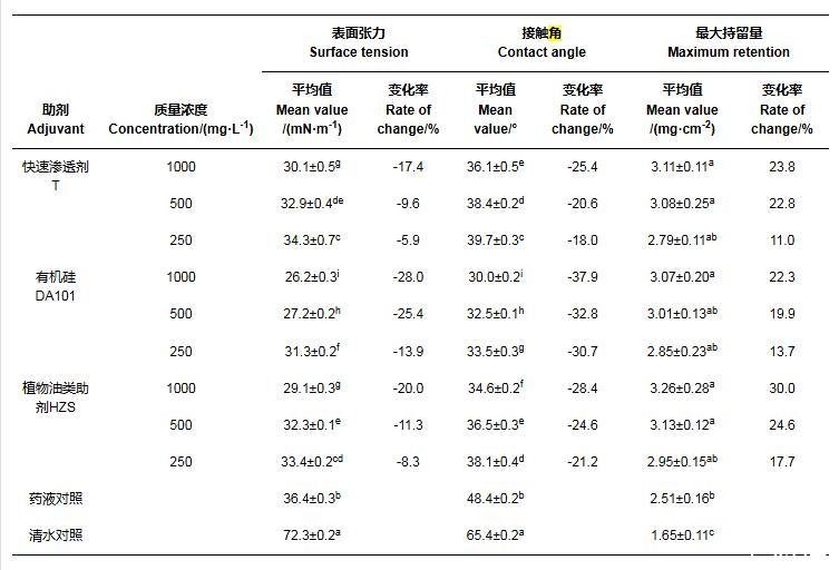 2.1添加噴霧助劑后藥液理化性質(表面張力、葉面接觸角)的變化