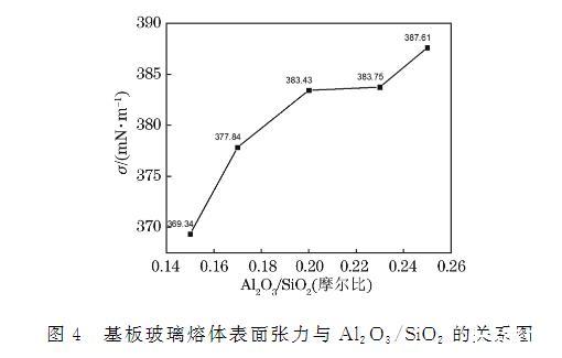 圖4 基板玻璃熔體表面張力與Al?O?/SiO?的關系圖